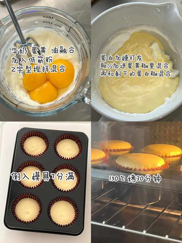 雞蛋2個,玉米油25g,牛奶35g,低筋粉50g,糖20g.