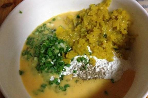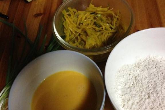 南瓜也可以用老南瓜我這次用的嫩南瓜媽媽正好用南瓜炒個小菜我就借用瞭點把蔥和蒜切碎南瓜切絲把這些材料倒在一起加點鹽加點胡椒粉再加半碗水攪勻就可以水的量跟具體材料的多少而定不要調的太稠