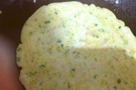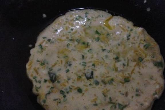 鍋中倒少許油倒入一點面糊攤成均勻的薄餅小火煎註意火不要太大容易糊