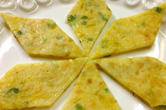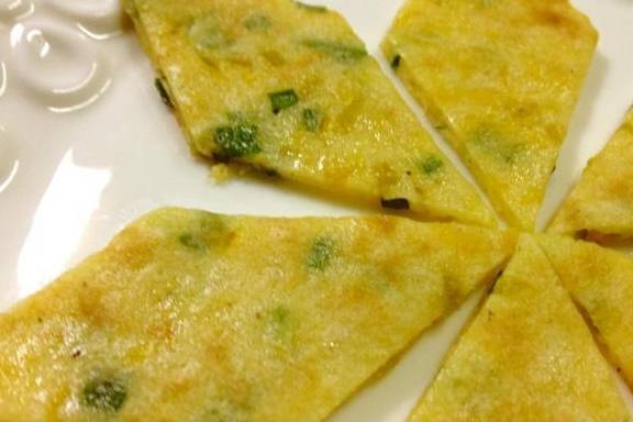 煎至兩面金黃就可以出鍋瞭,用刀切成塊裝盤