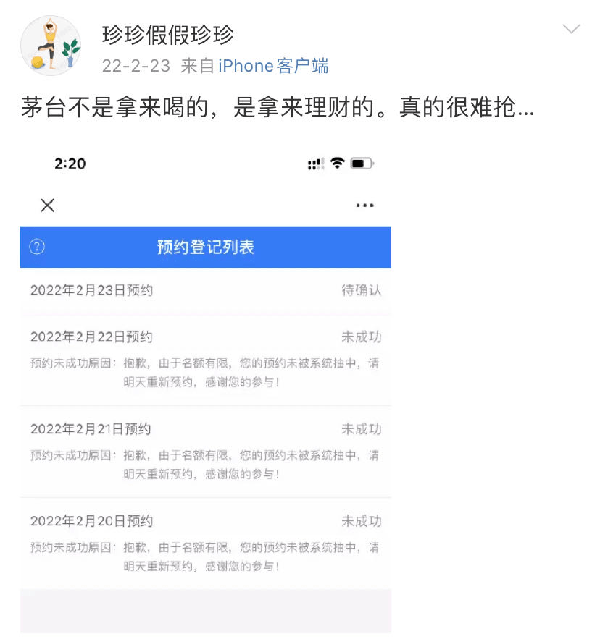 微博網友“珍珍假假珍珍”:“茅臺不是拿來喝的,是拿來理財的,真的很難搶。”