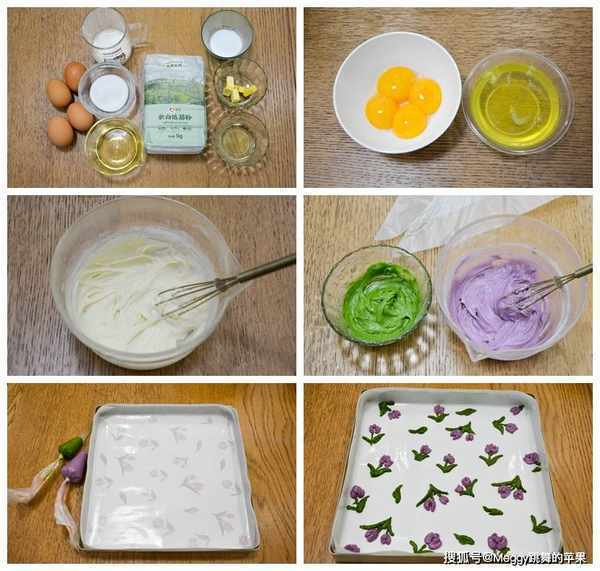 【圖案】 黃油15克,糖粉15克,蛋清15克,低筋面粉15克,紫色綠色食用色素少許