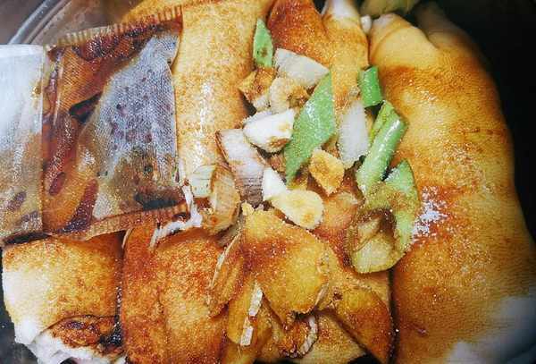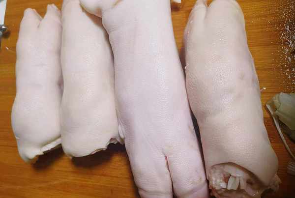 首先把四隻大豬蹄子洗凈把豬毛刮幹凈,有些賣豬肉的可以幫你免費用火烤幹凈脫豬毛,大傢可以問一問哦,不提供這項服務的話,那就隻好自己用刀慢慢刮瞭。