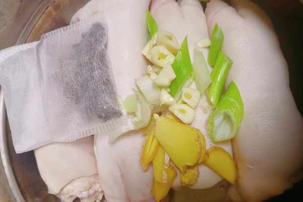 然後把剛才切好的老薑片,蔥還有蒜片放上面鋪好,隨性點亂丟也行,這樣燉出來的豬蹄更富自由的味道,可以試試。