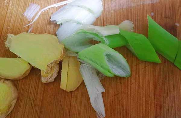 老薑切成半根筷子厚的片,不要選用嫩薑,香味不夠濃烈,並且在燉的過程中容易燉爛,燉爛瞭會影響豬蹄口感,大蔥也是切得和薑片差不多大塊就行瞭。