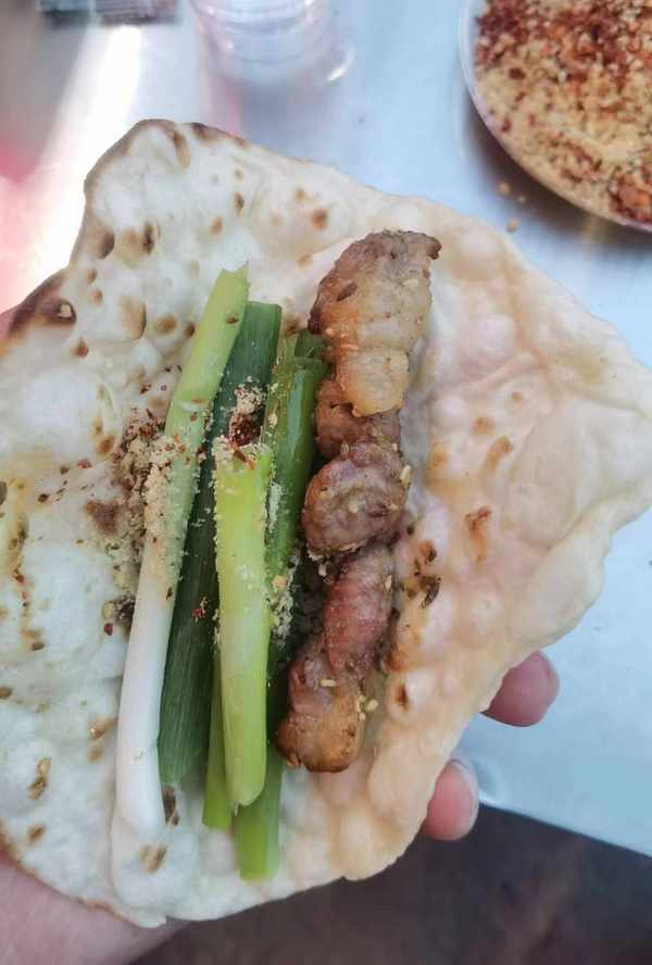 淄博燒烤的靈魂是小蔥還有小餅,把這兩者搭配在一起,再來上自己烤的肉串,按照個人的口味,往裡面加入小料,或者是其它的菜,這樣卷在一起吃,那感覺立馬就上來瞭,就這種吃法,也是讓人甚是回味。