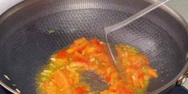 6:起鍋燒油,下入蔥薑炒香,再加入西紅柿,開大火翻炒,炒出汁水。