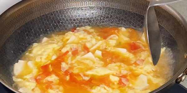 9:開大火把湯汁收至濃稠,再倒入雞蛋液,攪拌均勻,做出漂亮的蛋花。