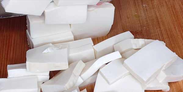 1:準備1塊豆腐,用刀切成薄片,0.5毫米厚即可,放入碗中備用。