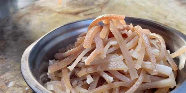 2:豬皮煮好後,用刀把油脂剔除,再改刀切成長條,放入碗中備用。
