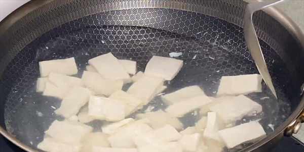 5:鍋中燒開,加入半勺鹽,下入豆腐塊,焯水1分鐘,去除豆腥味。