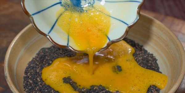 5:碗中打入2個雞蛋,快速打散,倒進黑芝麻中,再攪拌均勻,變成這樣子。