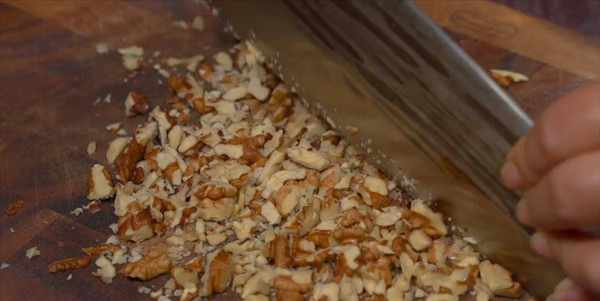 3:準備幾個核桃,剝出果肉,大概30克左右,再用刀切碎,盡量切碎一些。