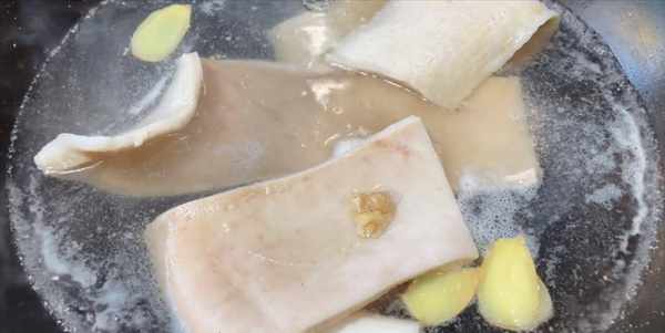 1:豬皮洗凈,冷水下鍋,放入薑蔥料酒去腥,開小火煮開,再煮6分鐘。