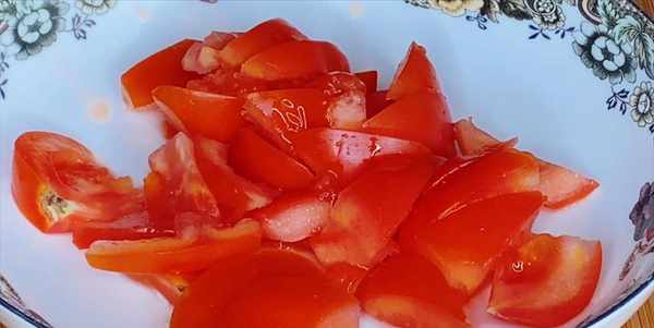 2:西紅柿洗凈,切掉根蒂,改刀切成小塊,如果喜歡吃皮,可以剝掉。