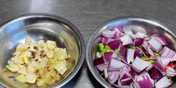 4:準備配料,青椒切小塊;洋蔥洗凈切塊;小米椒切小圈;生薑打算切碎。