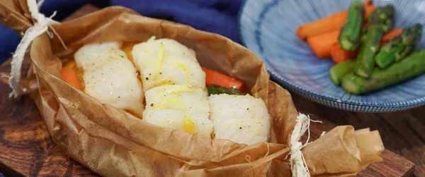 和脆嫩的蘆筍一起包進油紙裡烤熟,蘆筍脆甜,龍利魚果香襲人,食欲一下就來瞭。