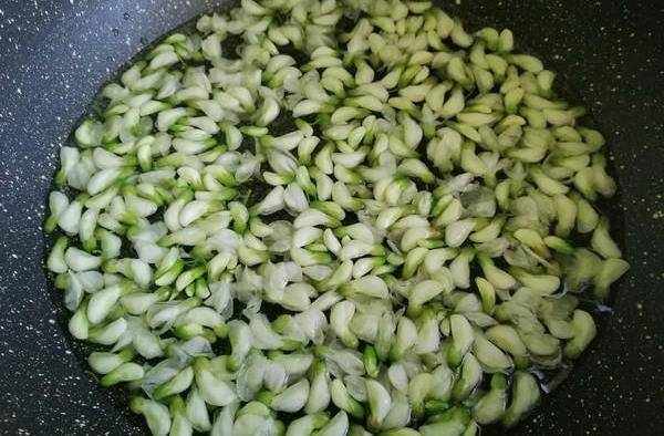 2.鍋裡燒水,水開之後放入槐花,焯燙10秒撈出,控幹水分備用。