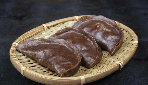 這黑黑的大餃子,他的面皮又是什麼做的呢?看著像巧克力,它的皮是雜糧做的,個頭很大,三個就可以吃飽瞭!