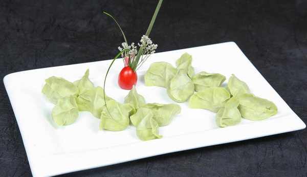 這盤餃子顏色特別好看,還有漸變的顏色,她的餃子皮是用兩種顏色的面團做的,白色的地方是普通面粉,上面的綠色是用菠菜汁和的面,顏色特別好看,像一個花朵,一定特別好吃吧!
