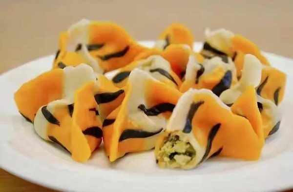 這一款是虎皮餃子,今年是虎年,今年特別流行虎皮餃子,外觀可愛呆萌,這款虎皮餃子的面皮有三種顏色,白色,黑色,黃色,白色部分就是普通面粉,黑色部分是用黑芝麻粉加白面粉做的,橙色部分是胡蘿卜加白面粉,這麼好看呆萌的餃子,怎麼都能吃上一大盤?
