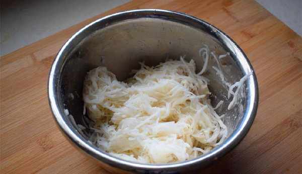2、白蘿卜絲加1勺鹽醃制約5分鐘,待微微醃出水分後用手擠出大部分的水,然後在蘿卜絲裡加30克面粉拌勻;