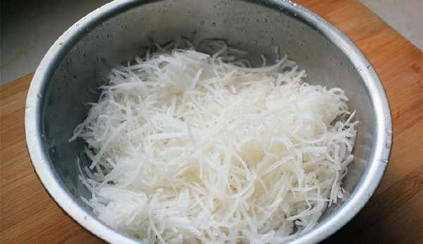 1、將白蘿卜洗凈後去掉頭尾並去皮,然後用擦子擦成絲;