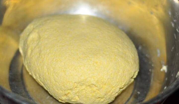 第一步:在盆中倒入300克玉米面,倒入開水燙面,燙一下的面疙瘩更容易消化,攪拌一下,然後稍微放涼之後再裡面加入100克面粉,一勺鹽增加面粉的筋性,攪拌均勻之後倒入50克的清水和面,和成面絮狀之後下手揉成面團,蓋上蓋子醒面20分鐘。