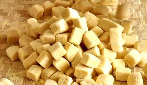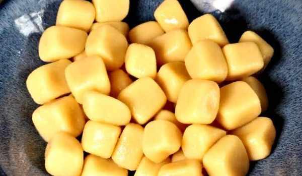 第五步:準備一個幹凈的盆,在裡面撒上適量的幹面粉,將做好的玉米面小方塊放在盆中,用力的搖晃,一直搖晃至小面疙瘩沒有棱角的時候就可以瞭。