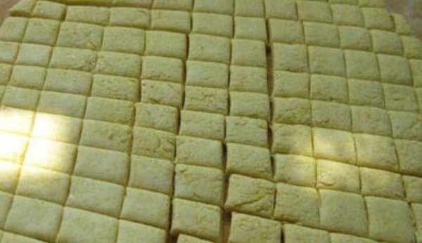 第四步:在案板上多撒上一些玉米面,用到將摔打好的玉米面面團用刀切成厚度大約1厘米的厚片,再用刀切成條狀,最後切成小方塊就可以瞭。