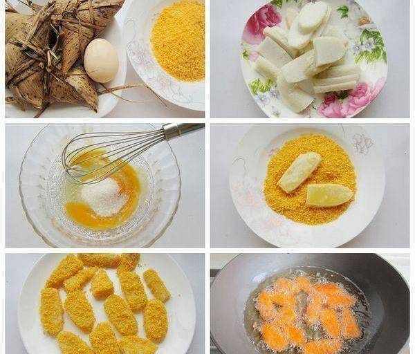 做法:1、把粽子去皮,用刀切厚片,雞蛋打散,加白糖拌均勻