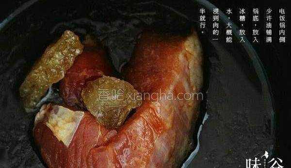 3.鍋底刷一層油,碗內的肉和醬汁倒入鍋內,放上冰糖,再倒入水,浸沒到肉的一半就行。按煮飯鍵,中途打開幾次把肉翻面,讓肉均勻沾上醬汁,待醬汁產差不多收幹便可以起鍋切片。