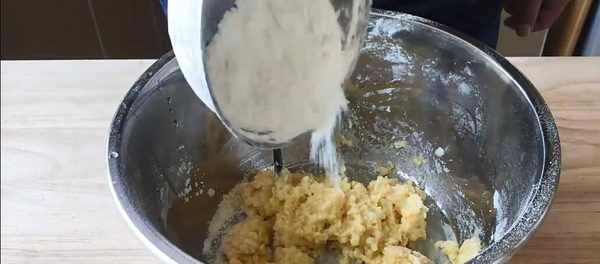 一,盆中加入70克普通面粉,40克玉米淀粉。20克白糖,30克熟油混合均勻。
