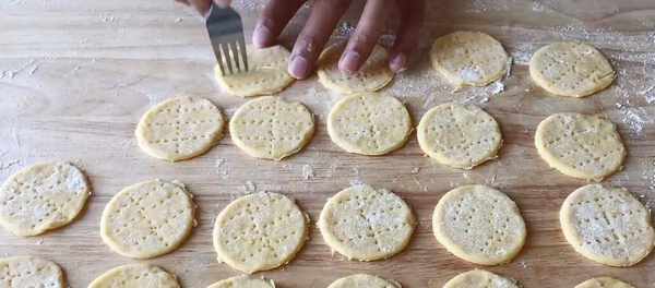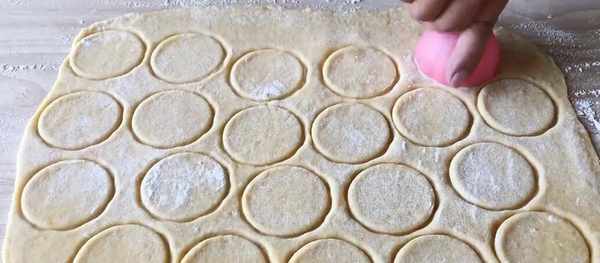 三,面板上撒上幹面粉。把剛才的面團搟成兩厘米厚的薄餅。搟好瞭面餅,用杯子蓋壓成小餅。把邊緣處多餘的搟皮撕掉。