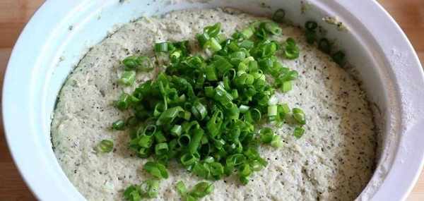 面糊已經餳發好瞭,加上鹽和蔥花,用筷子攪拌均勻,排除裡面氣體。