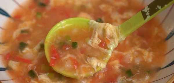 把湯制熬至粘稠,再把蛋液淋進來關火,加入小蔥花,加點香油增香,少來點米醋,用鏟子推動幾下,出鍋裝入裝盤,非常簡單的西紅柿山藥湯就做好瞭。