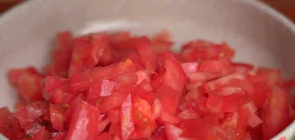 一個西紅柿清洗幹凈,對半切開,把根蒂去掉,切成薄片,最後切成小丁,切好後收入大碗。