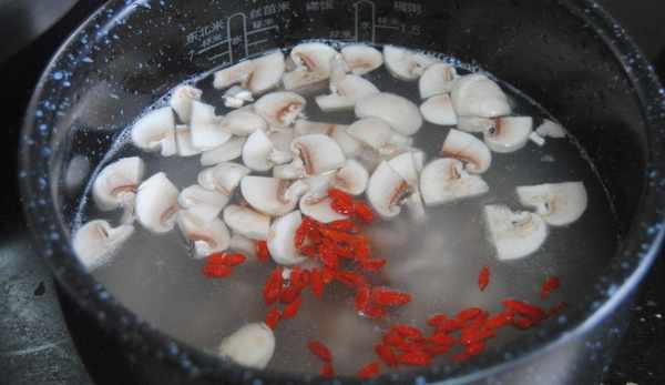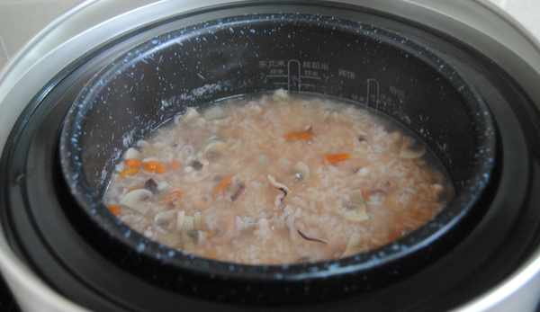 6.大米淘洗兩遍,飯煲內膽加入到稠粥1的刻度線,倒入八爪魚,蘑菇,鹽和清洗過的枸杞,蝦米