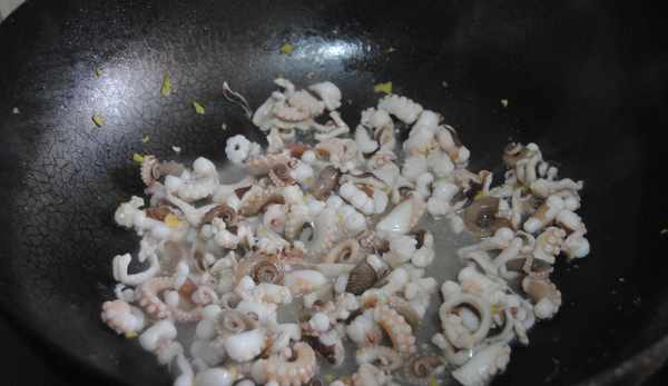 5.倒入八爪魚大火翻炒,加入料酒和胡椒粉翻勻即可