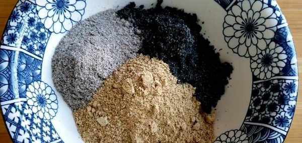再把放涼的黑芝麻,黑米,黑豆倒進研磨杯裡,磨成黑芝麻粉,打碎後倒進碗中。