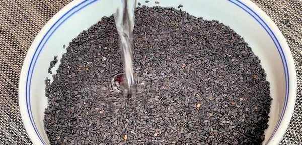 準備300克黑芝麻加入清水,把黑芝麻淘洗淘洗,清洗幹凈用漏勺撈出來控幹水分。