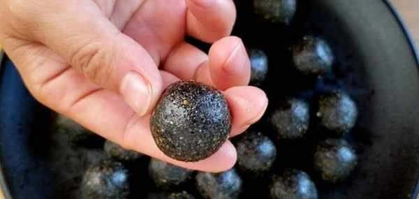 攪勻後抓起一把放在手心,抓捏緊實,整理成圓球,多抓捏一會表面出一層油,放進盤中,黑芝麻丸就做好瞭,做法非常簡單,裡面添加黑豆,黑米吃起來非常養生,口感香甜。