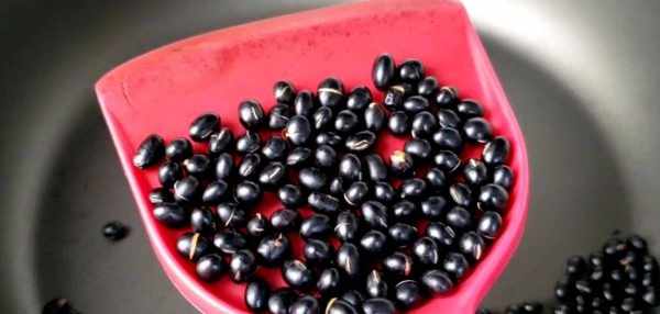 50克黑豆倒進大碗中,加入清水清洗幹凈,洗好後控幹水分,倒進炒鍋,小火慢慢翻炒,把黑豆炒至表面出現裂紋,倒進碗中。