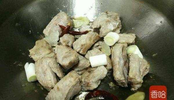 排骨500克、薑一小塊、大蔥適量、紅辣椒3個、冰糖10克、王致和腐乳3塊、腐乳汁4小勺、小蔥一根、玉米油適量
