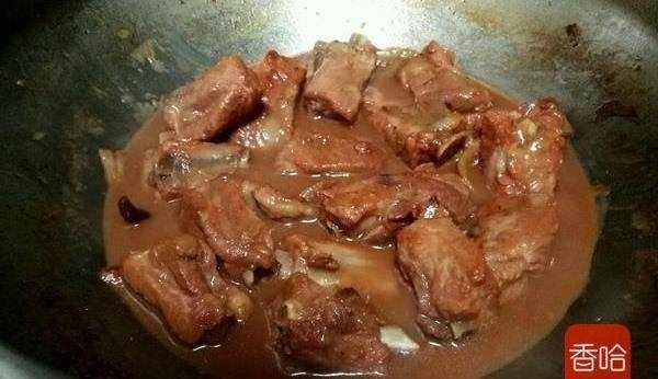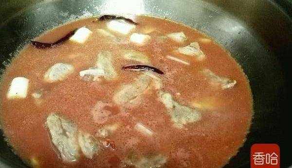 9.加入腐乳汁、一碗冷水,沒過排骨就可以瞭。大火燒開,小火慢燉40分鐘。(中途註意翻面,避免糊鍋)