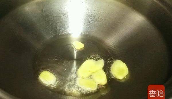 6.取凈鍋,熱鍋放油,放入薑片煸炒出香味。