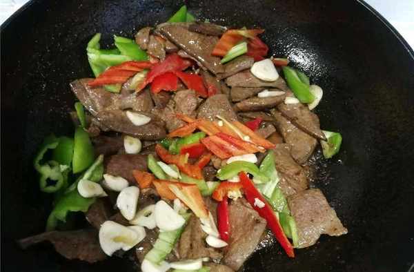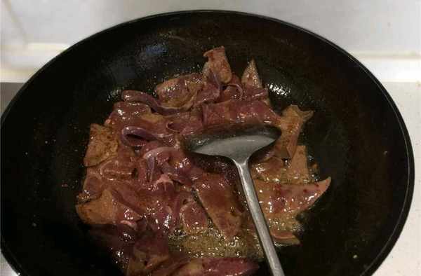 3、起鍋,鍋中倒入適量的食用油,油溫達到6成熱時,放入醃制好的豬肝,翻炒至豬肝變色之後盛出備用。