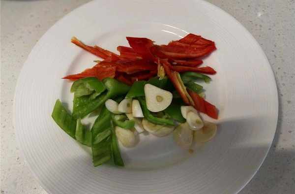 2、利用醃制豬肝的時間來處理其他食材,將青紅辣椒清洗幹凈用刀切成辣椒圈,大蒜去皮後用刀切成片,生薑去皮後用刀切成絲備用。