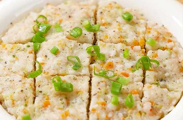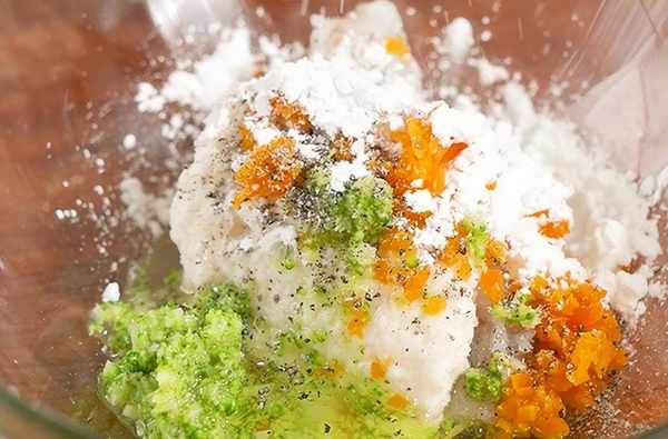 3、蝦仁泥,蔬菜碎,1個蛋清,適量淀粉和調味粉攪拌均勻。