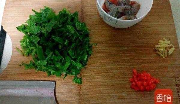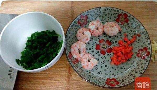 2.蝦去皮包蝦仁,用鹽、料酒、胡椒粉醃一會。菠菜切小段,薑切絲。胡蘿卜切小丁。